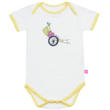 White short sleeve onesie with lovely multi colured rickshaw print.